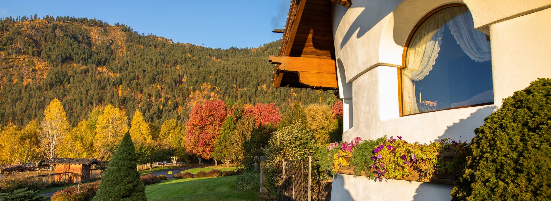 Side view of a unique white and brown home with arched window details and flower boxes, at the base of a mountain with fall colored trees